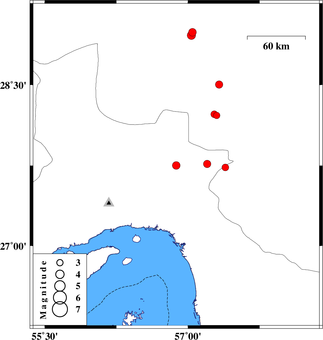 | 2021/04/28 | 05:02:05.0 | 09:32:05.0 | 27.733 | 57.392 | 12 | ML:3.2 | Kerman Province, 37 km North-West of Manujan | ||