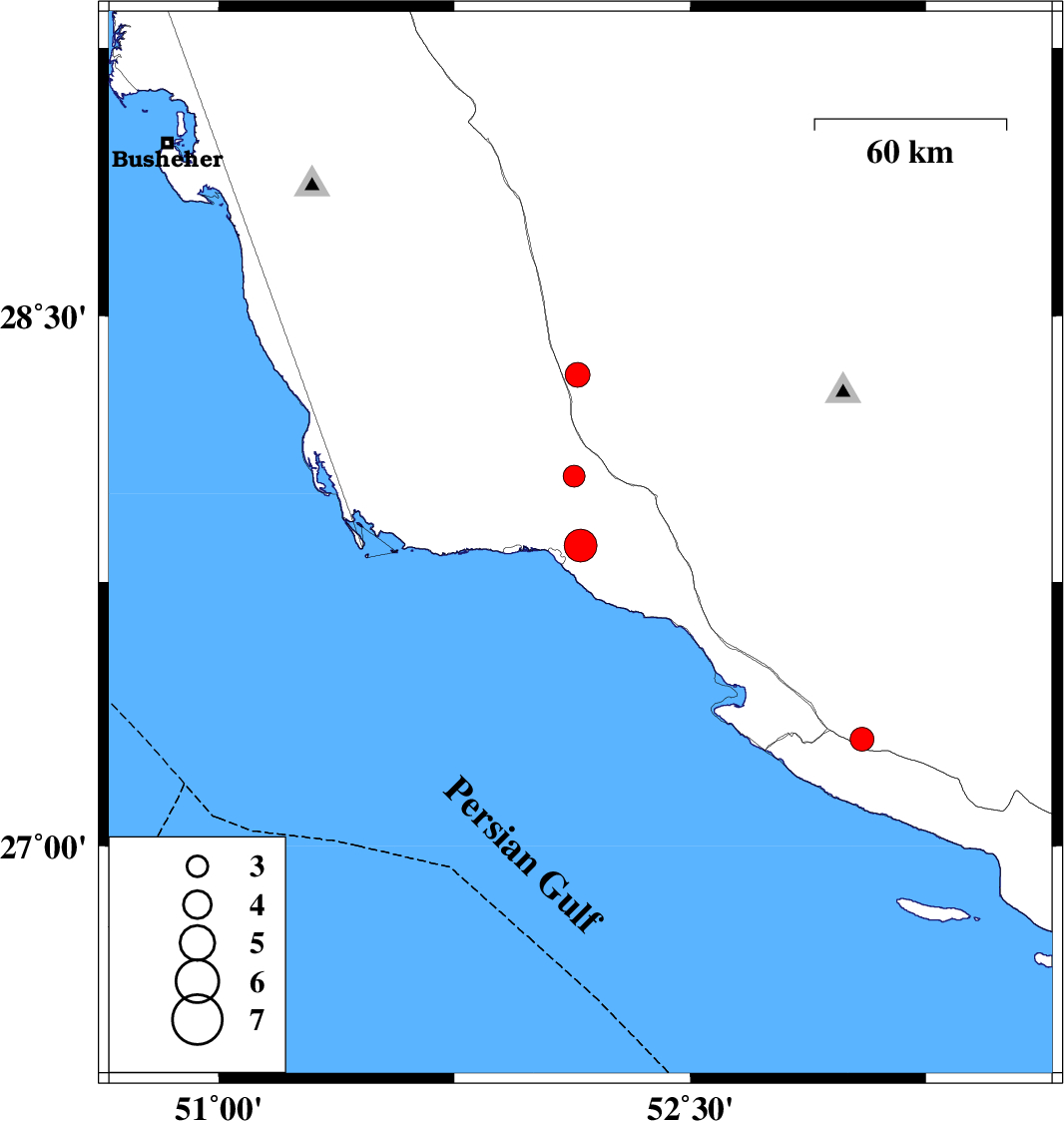 | 2021/04/17 | 18:18:31.7 | 22:48:31.7 | 28.049 | 52.131 | 12 | ML:3.1 | Bushehr Province, 26 km North of Bandar-e kangan |