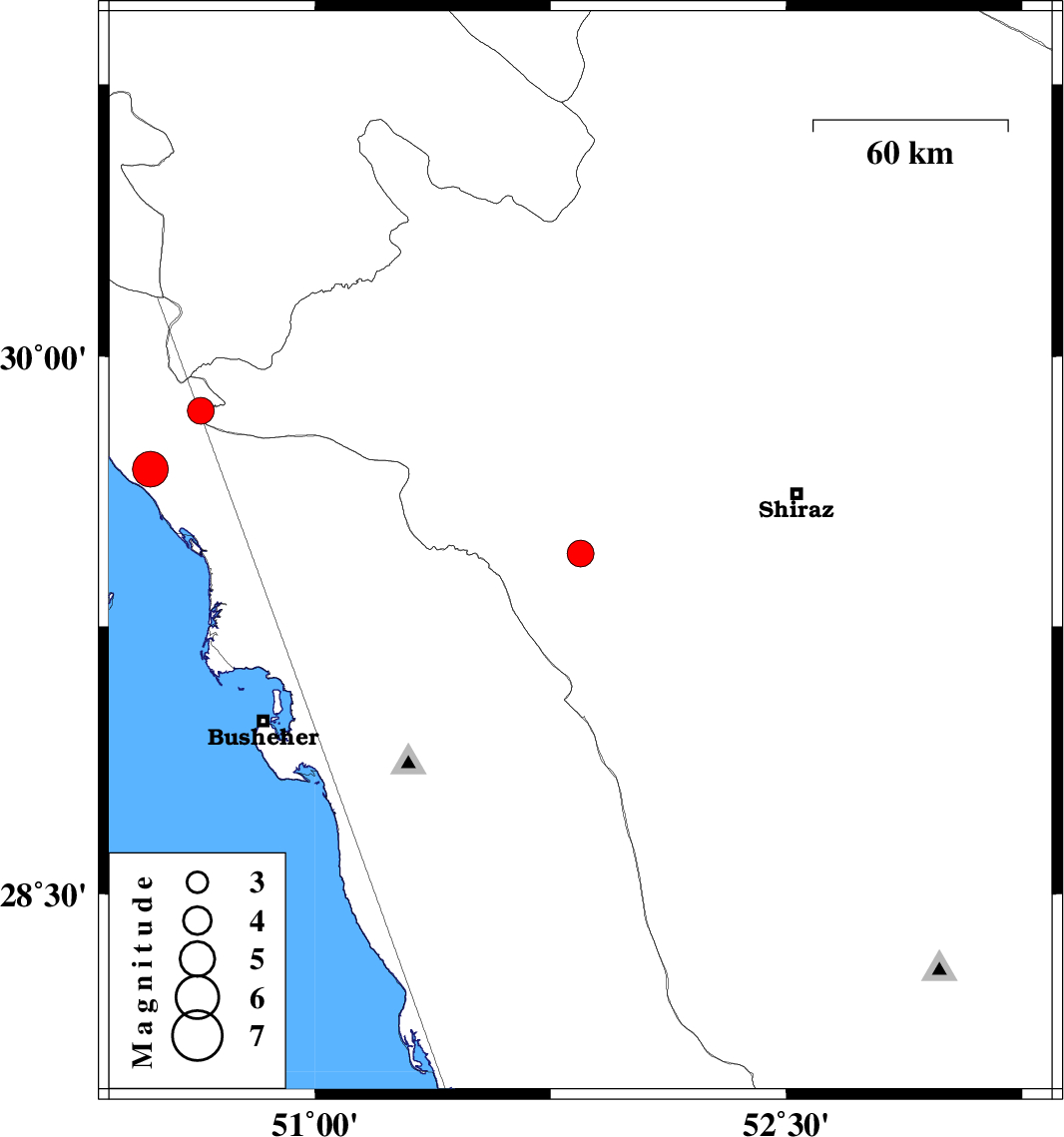 | 2021/05/23 | 09:38:49.2 | 14:08:49.2 | 29.849 | 50.637 | 12 | ML:3.8 | Bushehr Province, 33 km North-East of Bandar-e genaveh | ||