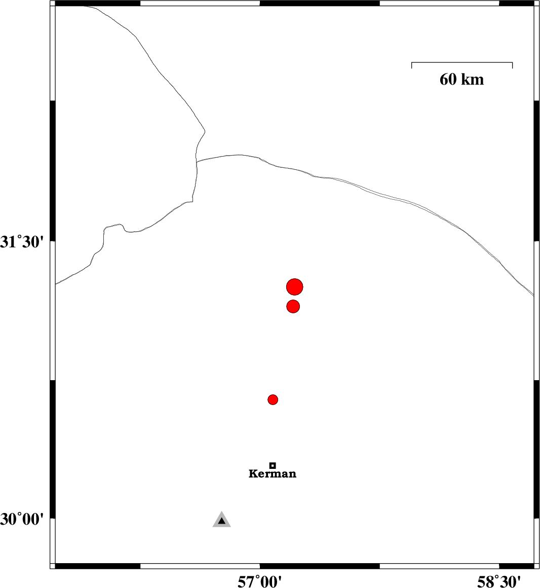 | 2021/05/31 | 05:11:28.2 | 09:41:28.2 | 30.645 | 57.081 | 12 | ML:2.8 | Kerman Province, 40 km North of Kerman |