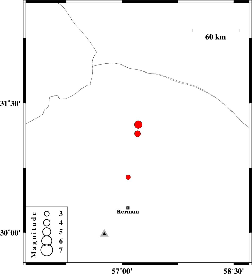 | 2021/05/31 | 05:11:28.2 | 09:41:28.2 | 30.645 | 57.081 | 12 | ML:2.8 | Kerman Province, 40 km North of Kerman |