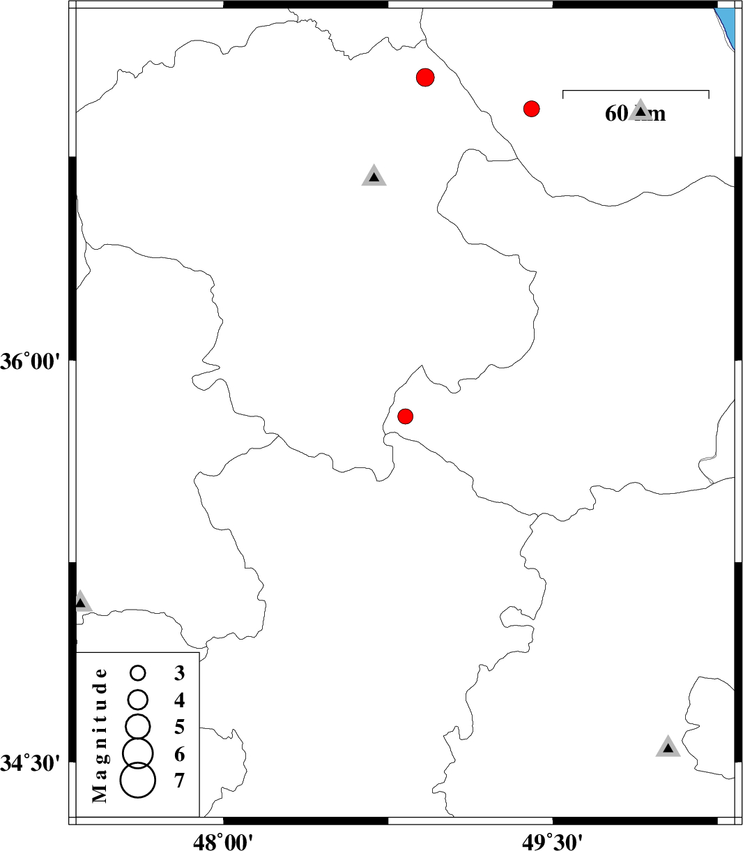 | 2021/05/17 | 01:34:41.3 | 06:04:41.3 | 37.039 | 48.919 | 7 | ML:3.6 | Zanjan Province, 14 km North of Abbar | ||