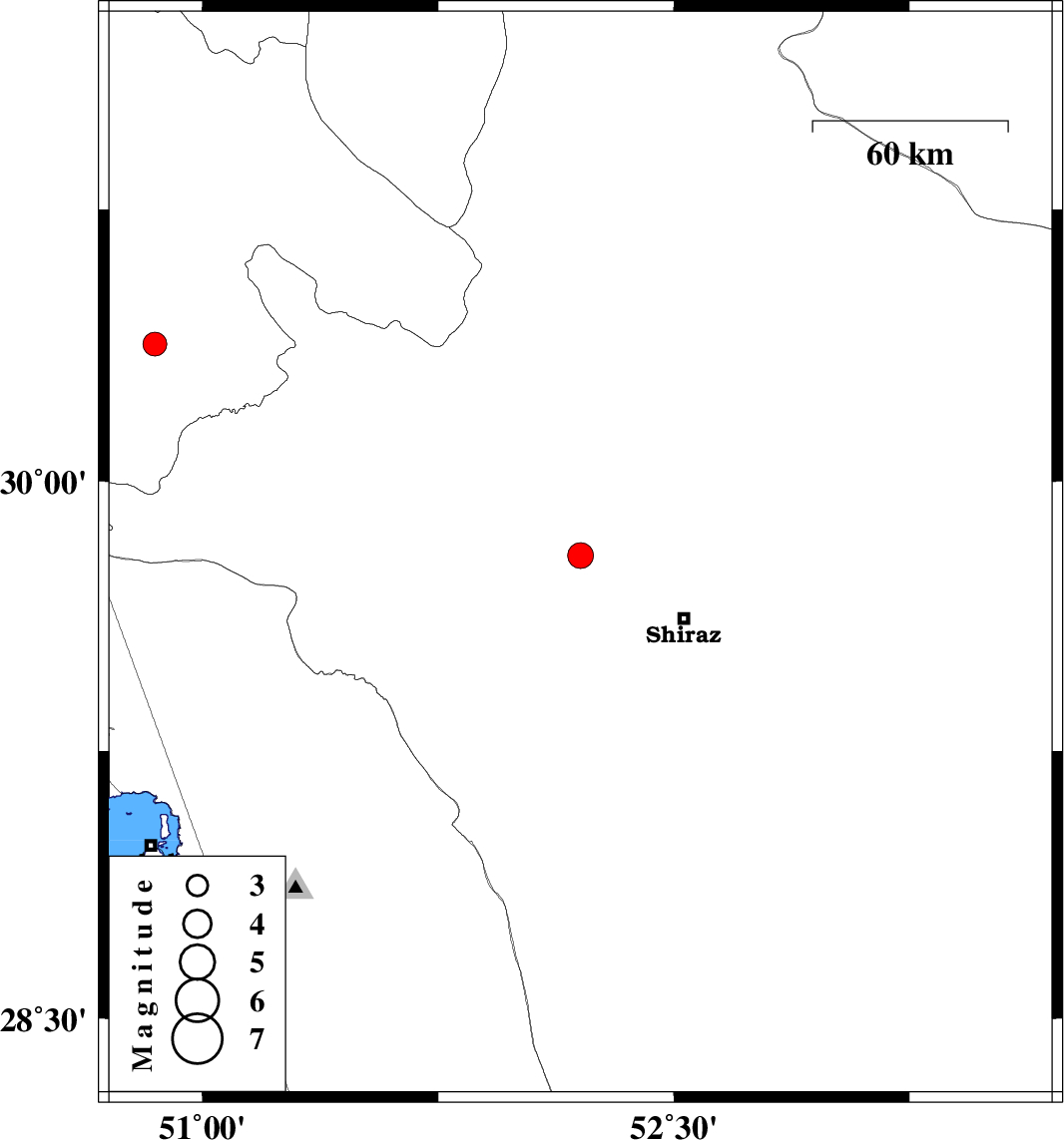 | 2021/06/09 | 12:20:32.8 | 16:50:32.8 | 29.794 | 52.203 | 12 | ML:3.6 | Fars Province, 37 km North-West of Shiraz | ||