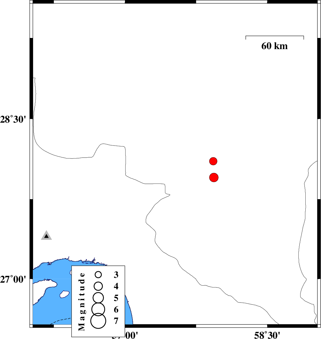 | 2021/07/05 | 07:37:15.9 | 12:07:15.9 | 28.222 | 57.523 | 12 | ML:3.7 | Kerman Province, 35 km North-West of Kahnuj |