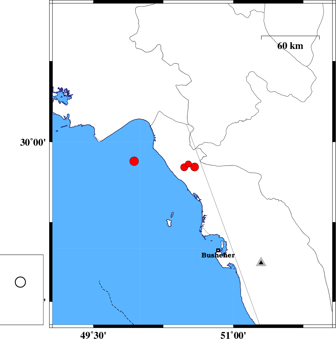 | 2021/07/29 | 23:47:25.9 | 04:17:25.9 | 29.783 | 50.562 | 12 | ML:4.3 | Bushehr Province, 24 km North of Bandar-e genaveh | ||