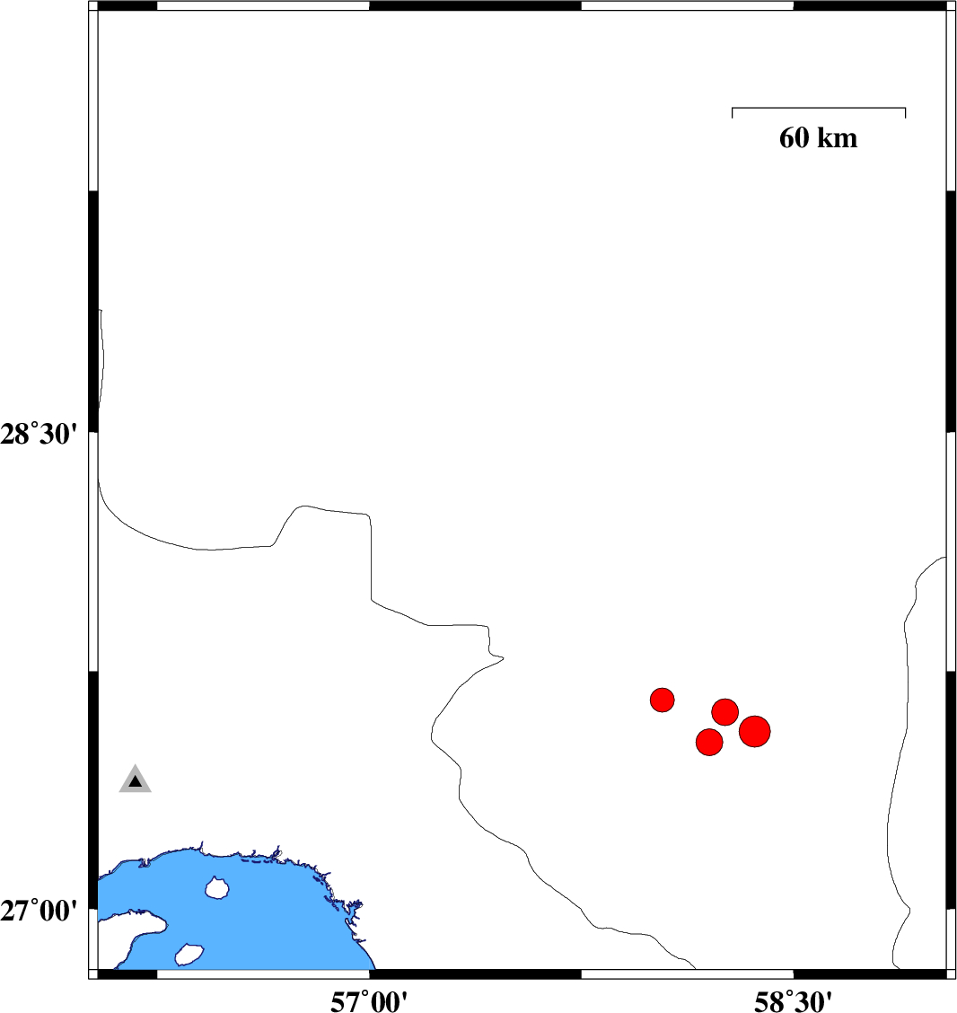 | 2021/08/12 | 12:24:06.2 | 16:54:06.2 | 28.332 | 57.655 | 16 | ML:5 | Kerman Province, 38 km South of Jiroft | ||