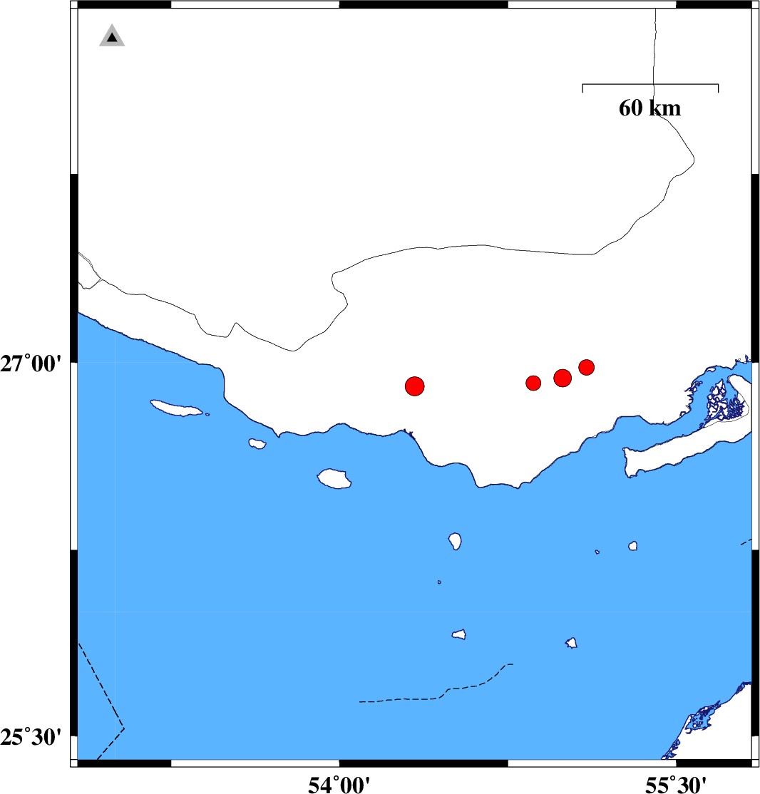 | 2021/08/08 | 06:04:50.3 | 10:34:50.3 | 26.938 | 54.993 | 22 | ML:3.5 | Hormozgan Province, 48 km North-East of Bandar-e lengeh | ||