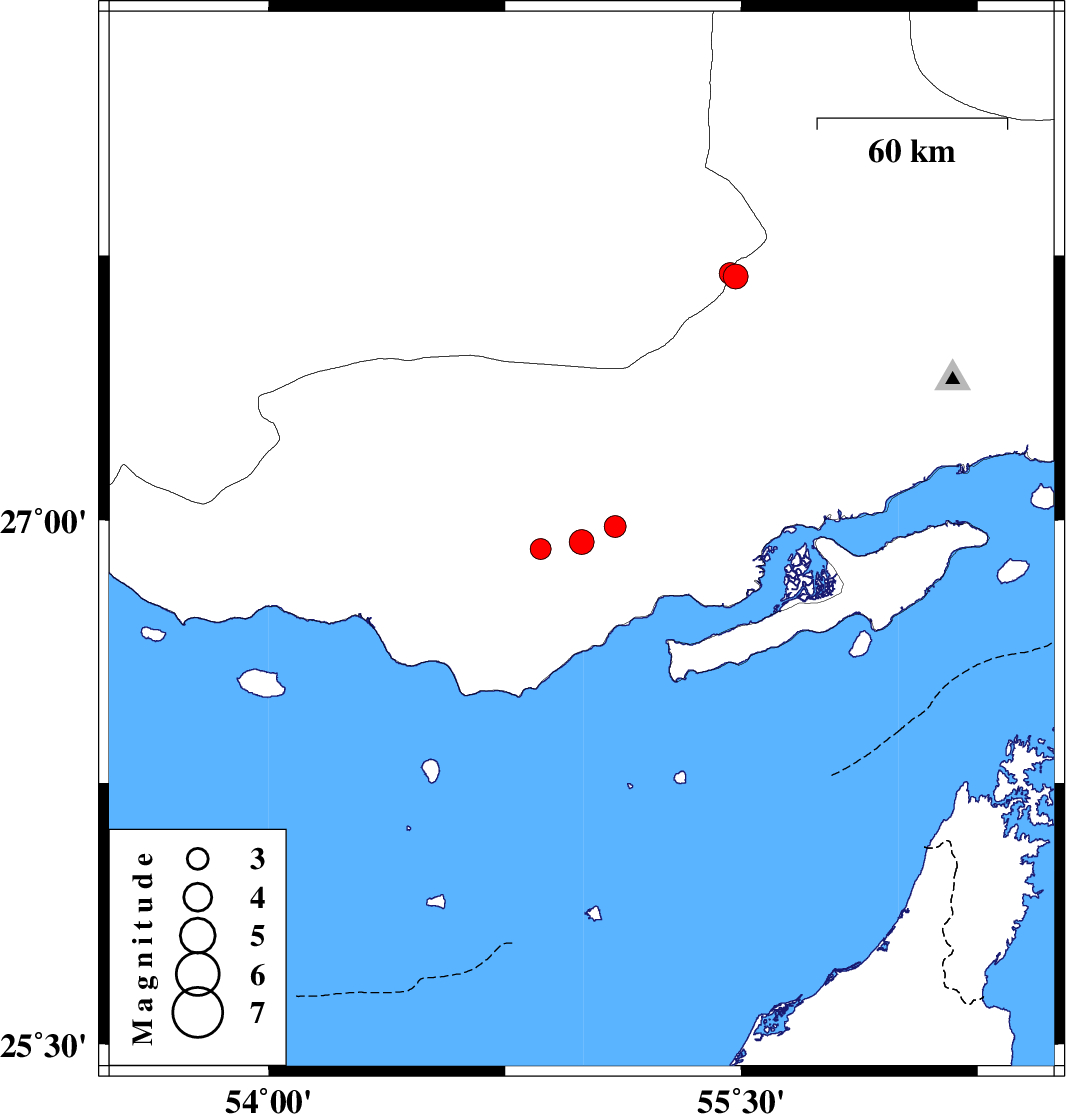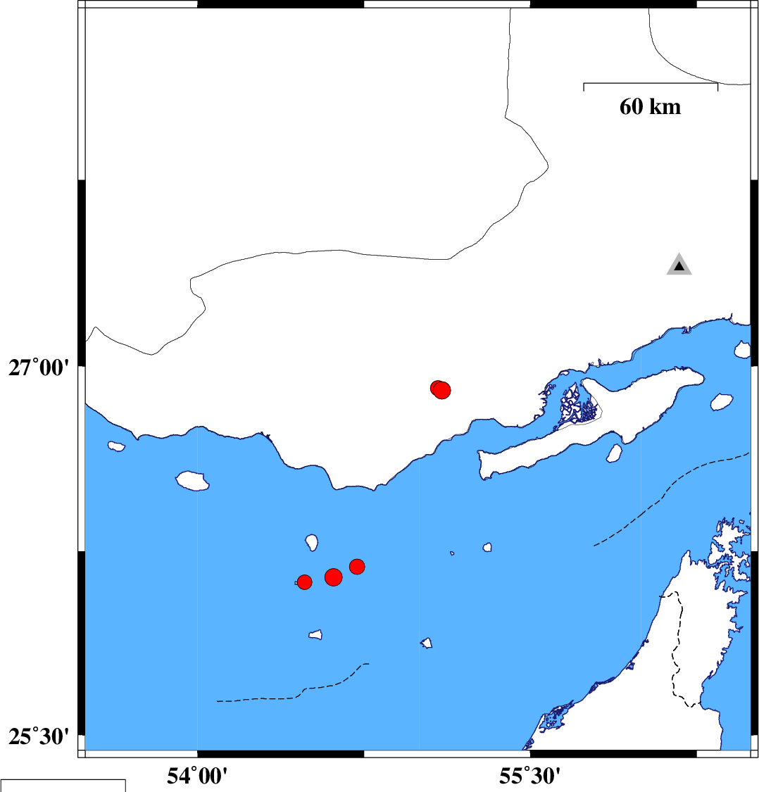 | 2021/08/08 | 06:04:50.3 | 10:34:50.3 | 26.938 | 54.993 | 22 | ML:3.5 | Hormozgan Province, 48 km North-East of Bandar-e lengeh | ||