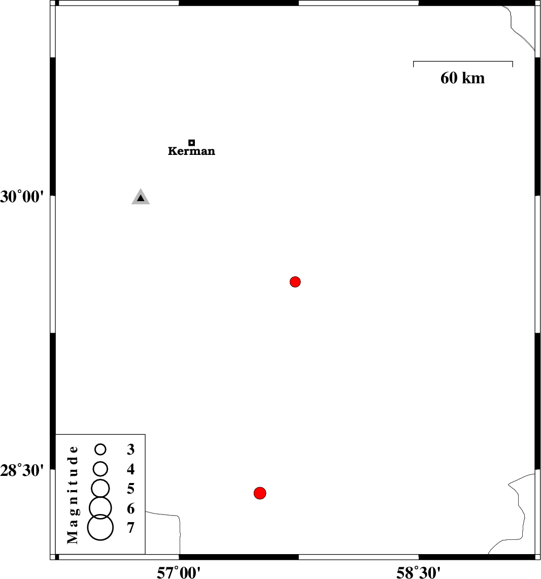 | 2021/08/14 | 09:15:02.7 | 13:45:02.7 | 28.368 | 57.507 | 9 | ML:3.4 | Kerman Province, 40 km South-West of Jiroft |