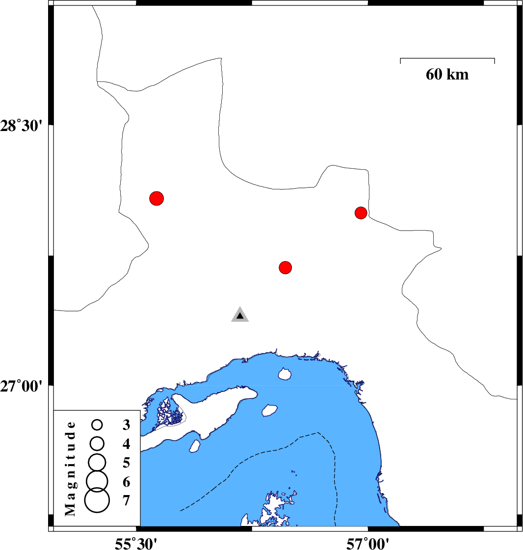 | 2021/08/22 | 22:27:49.2 | 02:57:49.2 | 28.078 | 55.632 | 12 | ML:4.1 | Hormozgan Province, 37 km South-West of Hajiabad |