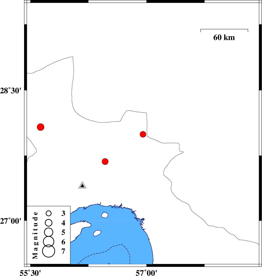 | 2021/08/22 | 22:27:49.2 | 02:57:49.2 | 28.078 | 55.632 | 12 | ML:4.1 | Hormozgan Province, 37 km South-West of Hajiabad |