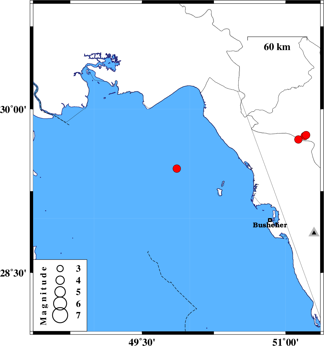 | 2021/09/14 | 04:48:06.7 | 09:18:06.7 | 29.457 | 49.863 | 12 | ML:3.7 | Persian Gulf, 64 km South-West of Bandar-e genaveh | ||
