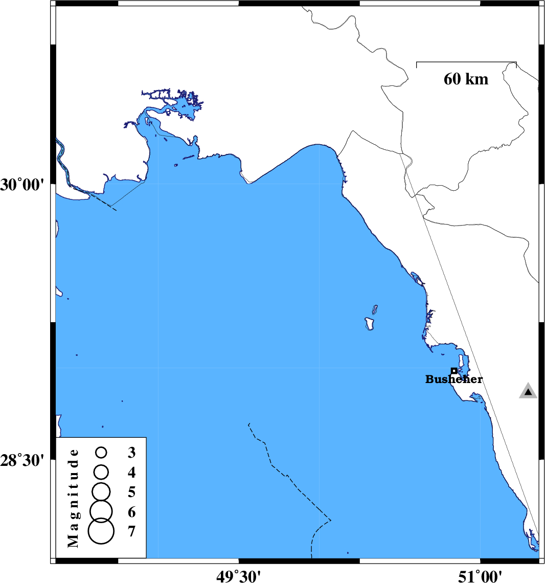 | 2021/09/14 | 04:48:06.7 | 09:18:06.7 | 29.457 | 49.863 | 12 | ML:3.7 | Persian Gulf, 64 km South-West of Bandar-e genaveh |