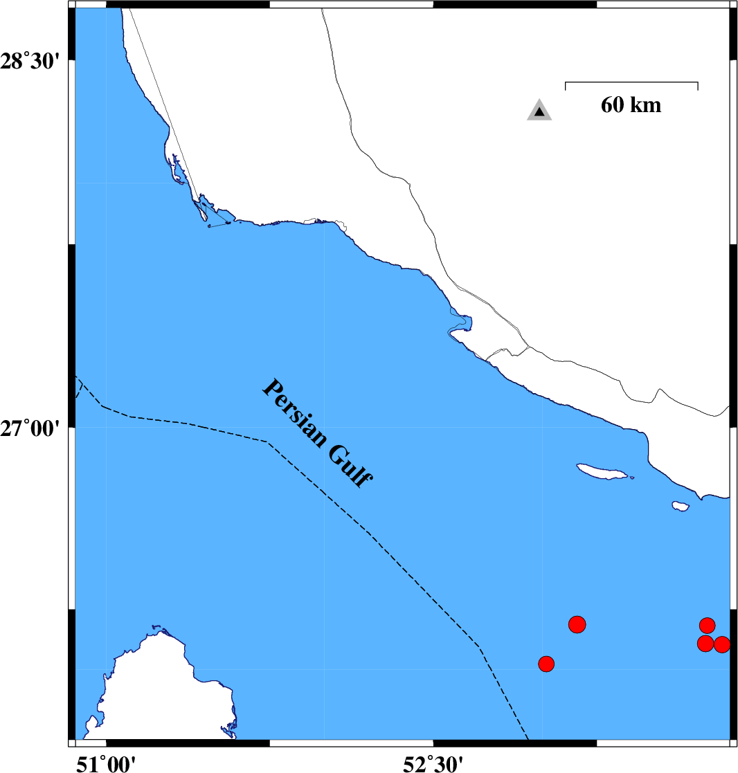 | 2021/09/19 | 22:11:08.1 | 02:41:08.1 | 27.372 | 52.5 | 12 | ML:3.5 | Persian Gulf, 43 km South-West of Mehr |