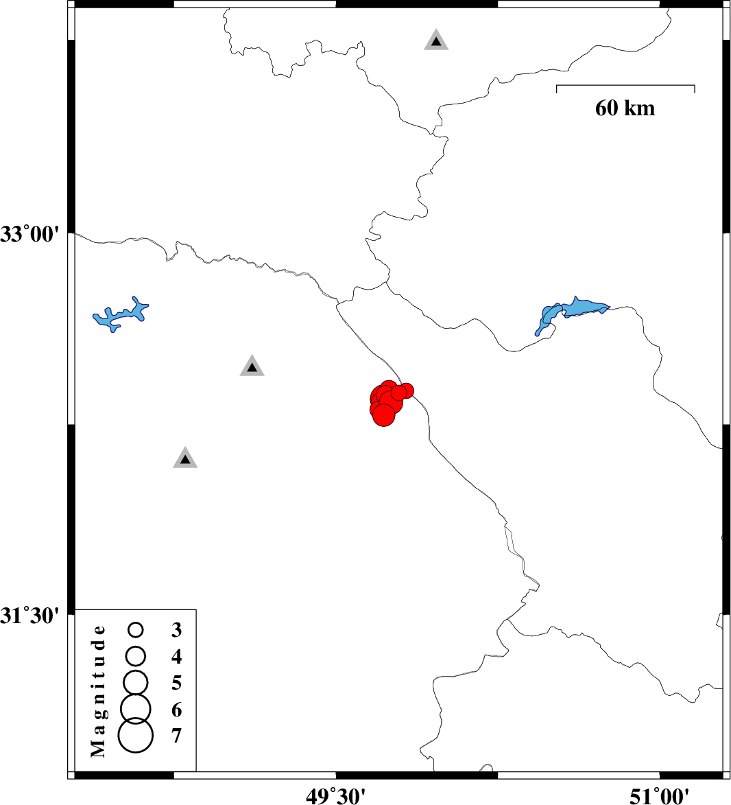| 2021/10/04 | 02:39:29.2 | 06:09:29.2 | 32.35 | 49.726 | 17 | ML:6 | Khoozestan Province, 39 km South-West of Chelgard |