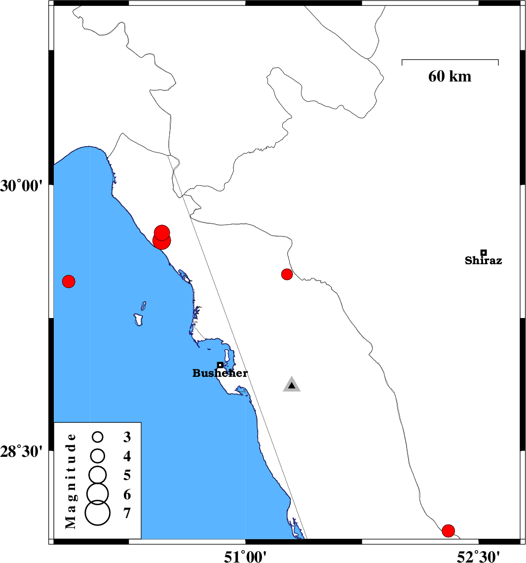 | 2021/09/14 | 04:48:06.7 | 09:18:06.7 | 29.457 | 49.863 | 12 | ML:3.7 | Persian Gulf, 64 km South-West of Bandar-e genaveh |
