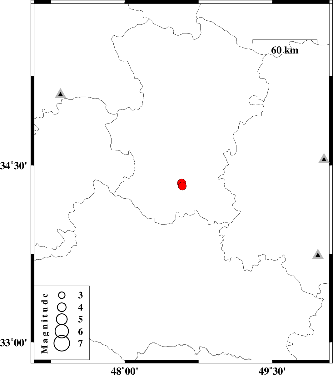 | 2021/10/12 | 15:39:46.4 | 19:09:46.4 | 34.325 | 48.586 | 12 | ML:3.6 | Hamedan Province, 22 km -West of Malayer | ||