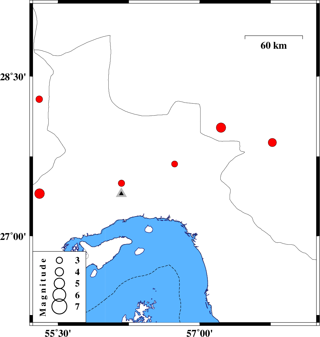 | 2021/09/21 | 08:07:52.6 | 12:37:52.6 | 27.882 | 57.767 | 12 | ML:3.9 | Kerman Province, 10 km of Kahnuj |