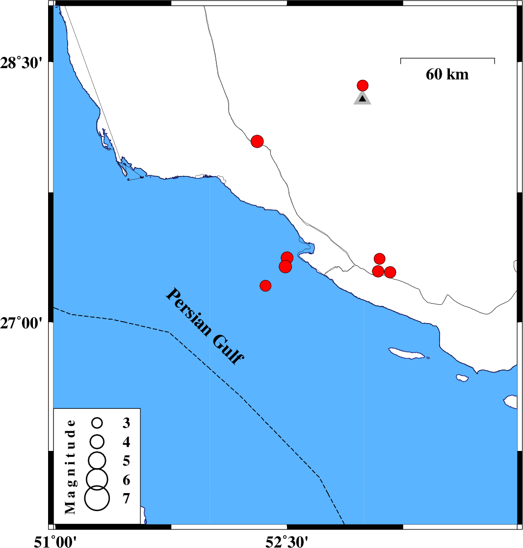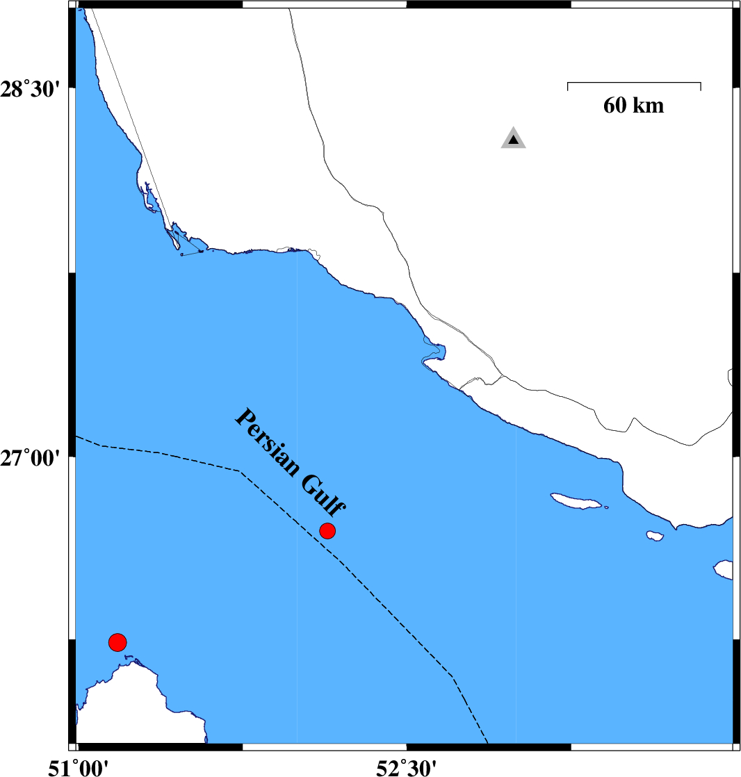 | 2021/09/19 | 22:11:08.1 | 02:41:08.1 | 27.372 | 52.5 | 12 | ML:3.5 | Persian Gulf, 43 km South-West of Mehr |