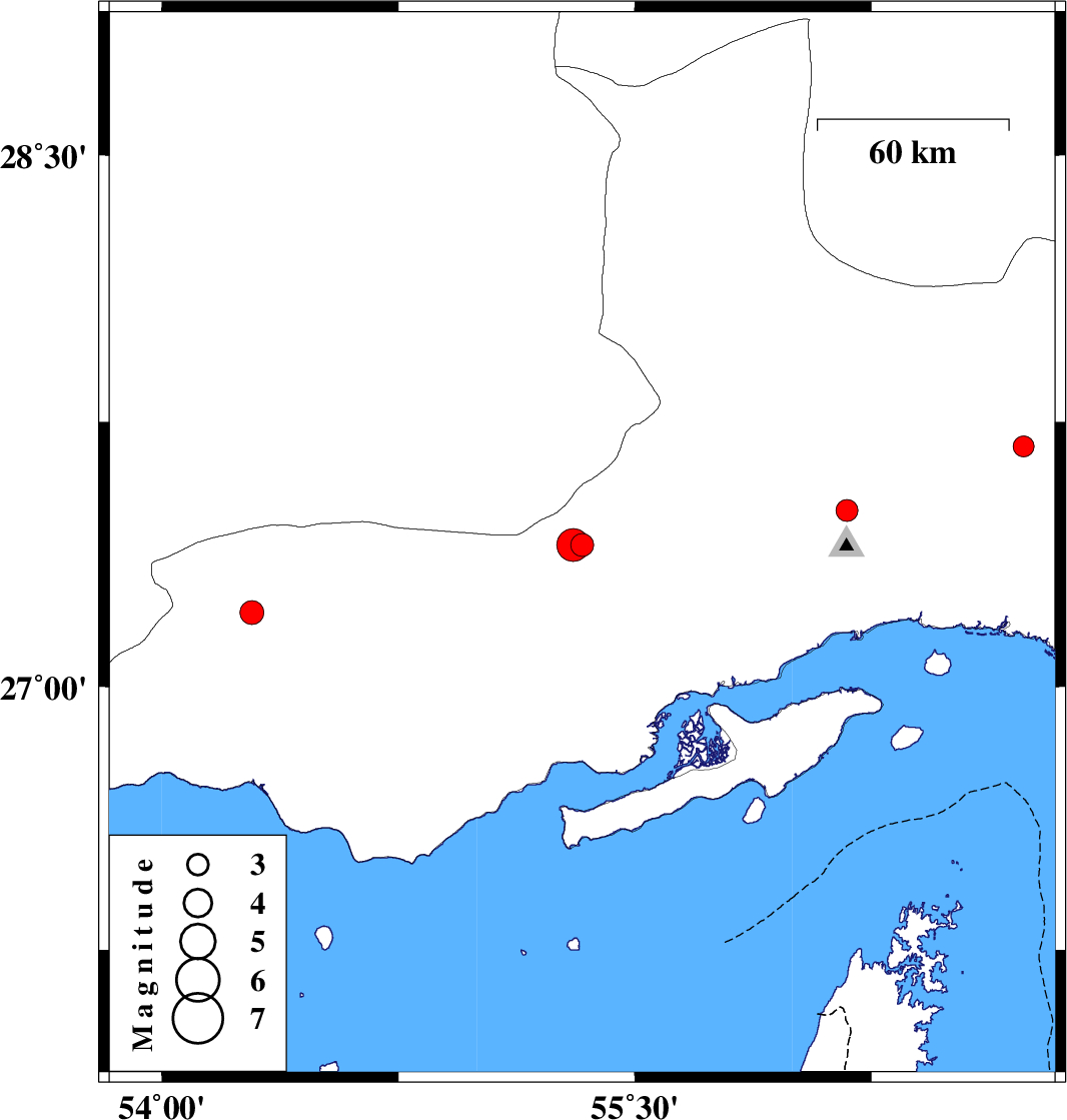 | 2021/10/10 | 16:11:25.8 | 19:41:25.8 | 27.401 | 55.305 | 12 | ML:4.7 | Hormozgan Province, 96 km North-East of Bastak |