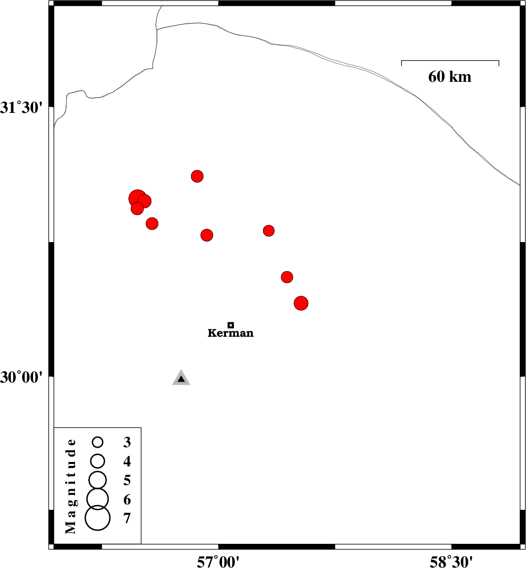 | 2021/11/09 | 19:31:53.1 | 23:01:53.1 | 30.409 | 57.532 | 12 | ML:4.1 | Kerman Province, 46 km North-East of Kerman | ||