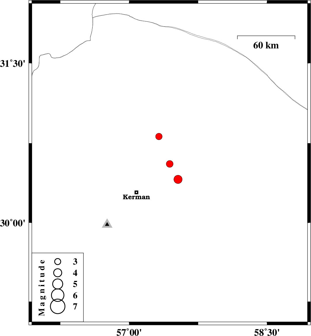 | 2021/11/09 | 19:31:53.1 | 23:01:53.1 | 30.409 | 57.532 | 12 | ML:4.1 | Kerman Province, 46 km North-East of Kerman | ||
