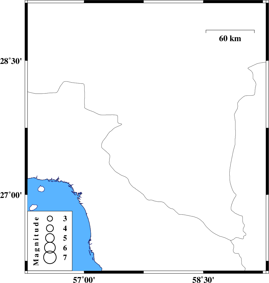 | 2021/11/11 | 21:36:55.9 | 01:06:55.9 | 27.639 | 57.789 | 14 | ML:3.3 | Kerman Province, 36 km South of Kahnuj |