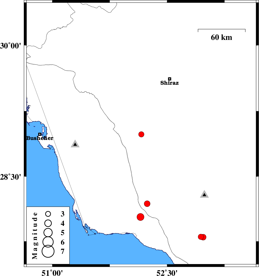 | 2021/10/31 | 07:49:13.3 | 11:19:13.3 | 27.798 | 52.972 | 10 | ML:3.5 | Fars Province, 29 km North of Mehr |