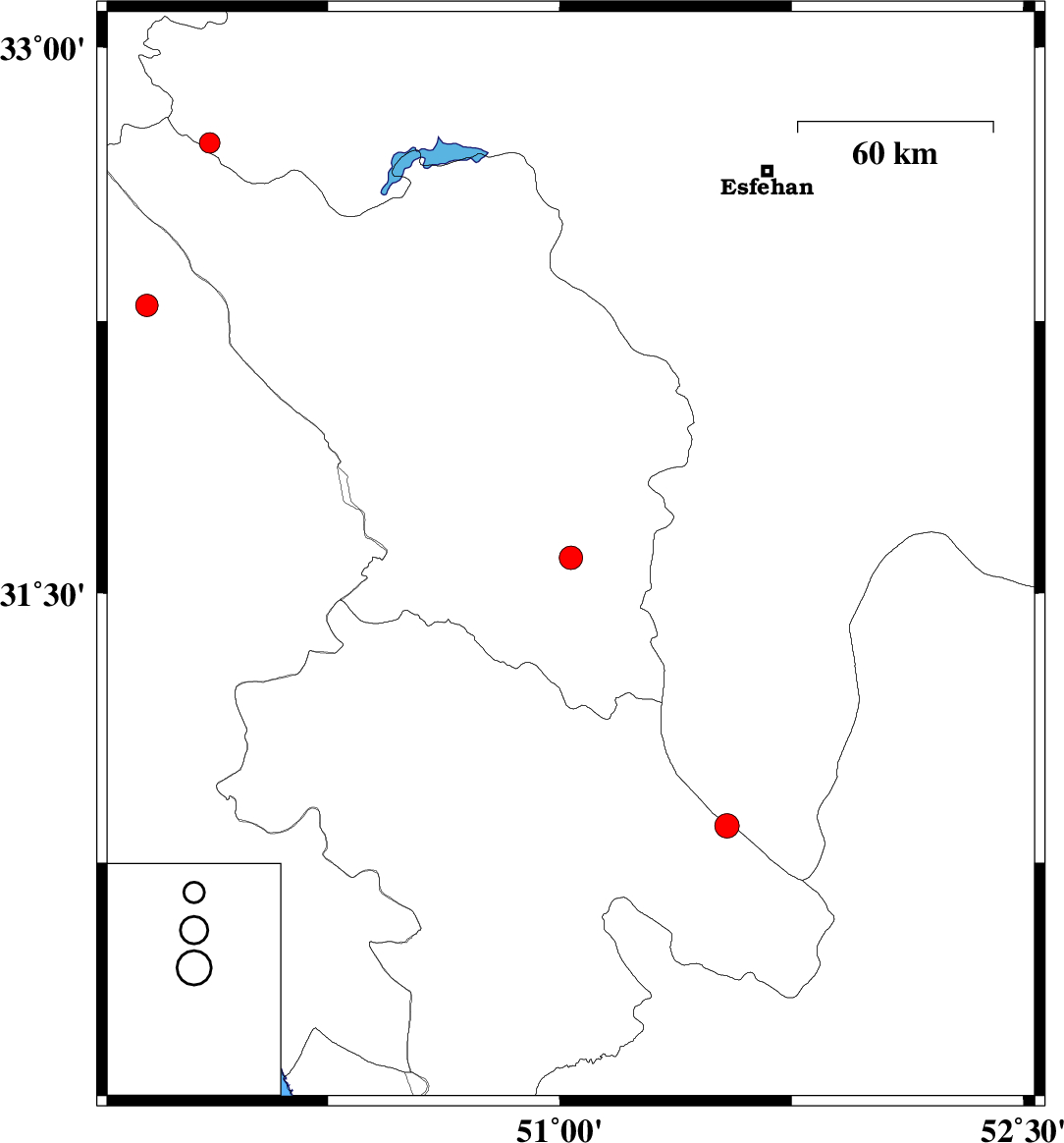 | 2021/11/16 | 22:36:19.4 | 02:06:19.4 | 32.739 | 49.867 | 12 | ML:3 | Esfahan Province, 32 km South-West of Fereydunshahr | ||