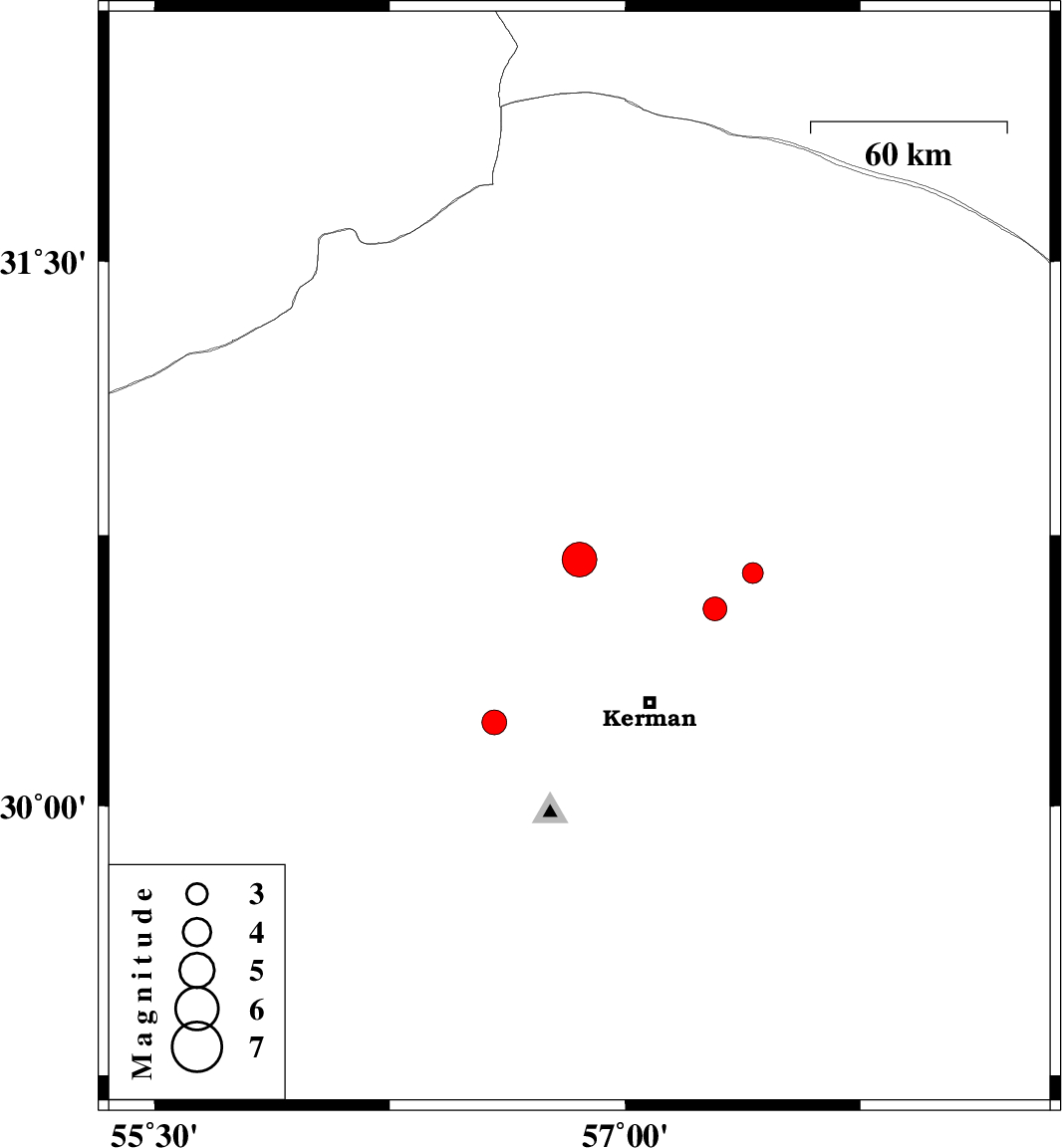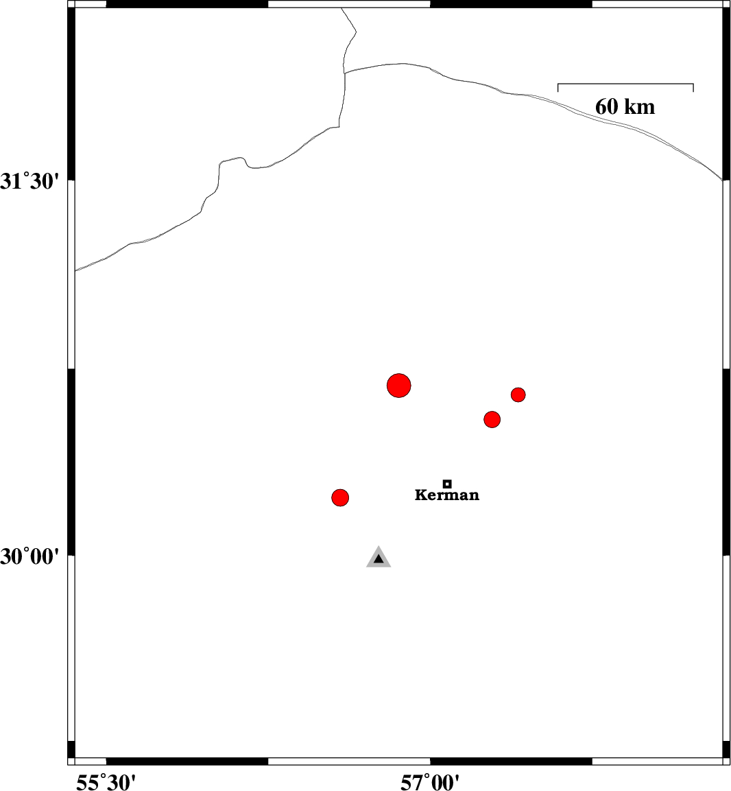 | 2021/11/30 | 21:10:59.1 | 00:40:59.1 | 30.645 | 57.406 | 12 | ML:3 | Kerman Province, 51 km North-East of Kerman | ||