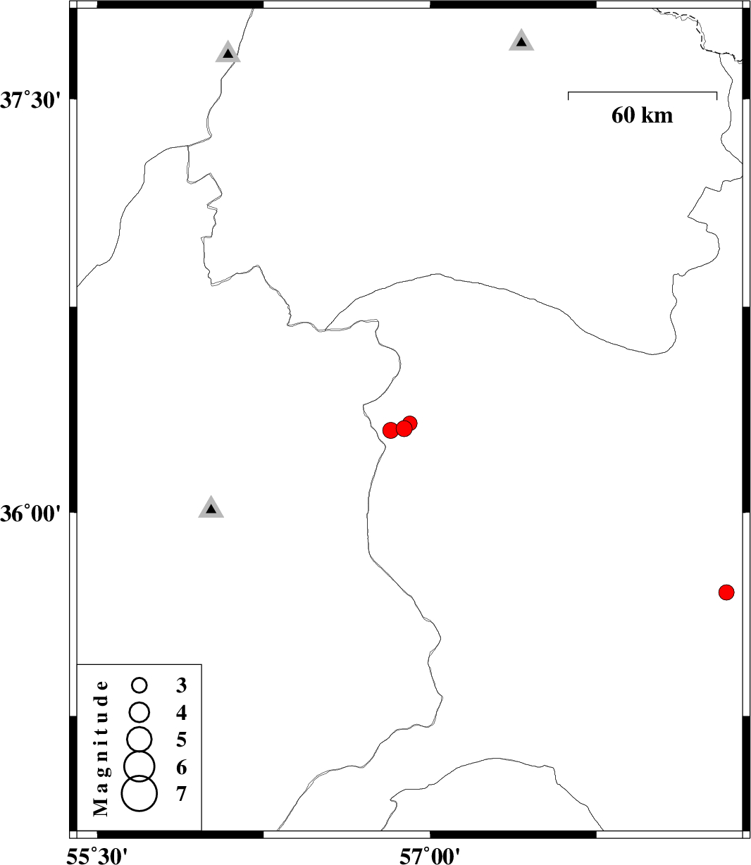 | 2021/12/14 | 16:42:31.2 | 20:12:31.2 | 36.3 | 56.822 | 12 | ML:3.3 | Khorasan(center) Province, 77 km -West of Sabzevar | ||