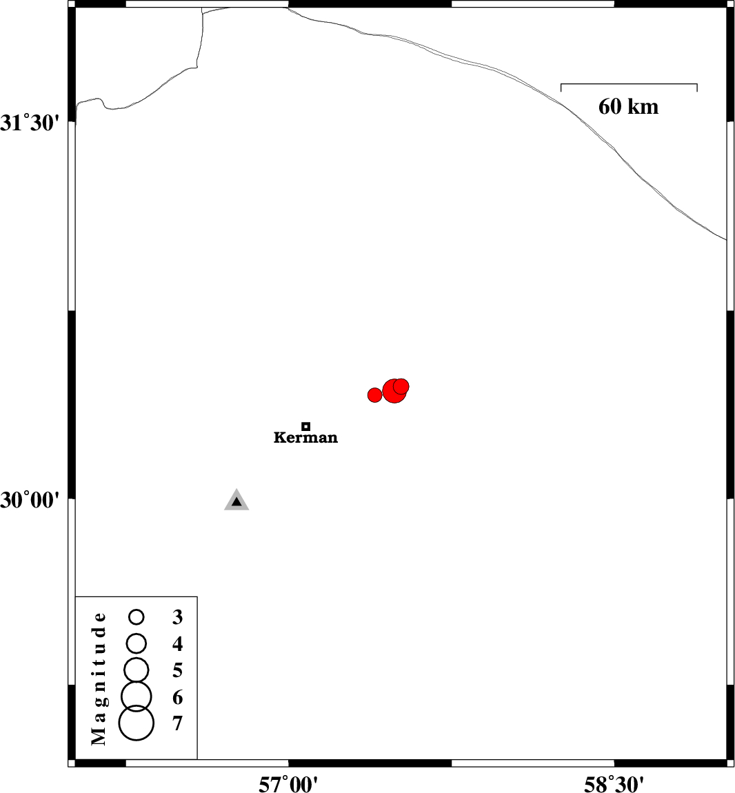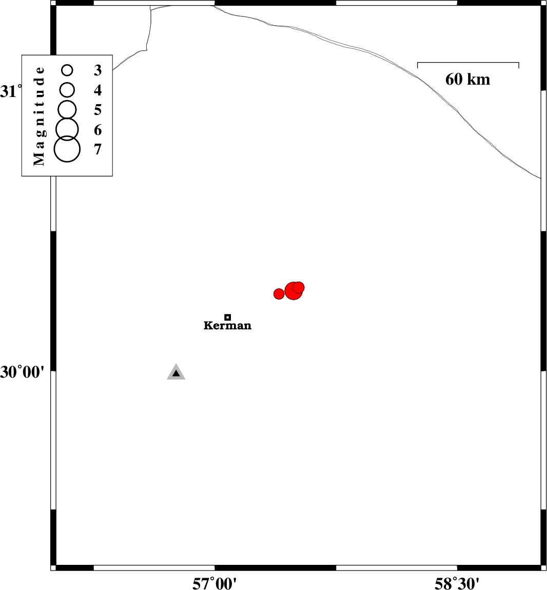 | 2022/01/16 | 07:52:15.2 | 11:22:15.2 | 30.413 | 57.396 | 12 | ML:3 | Kerman Province, 33 km North-East of Kerman | ||