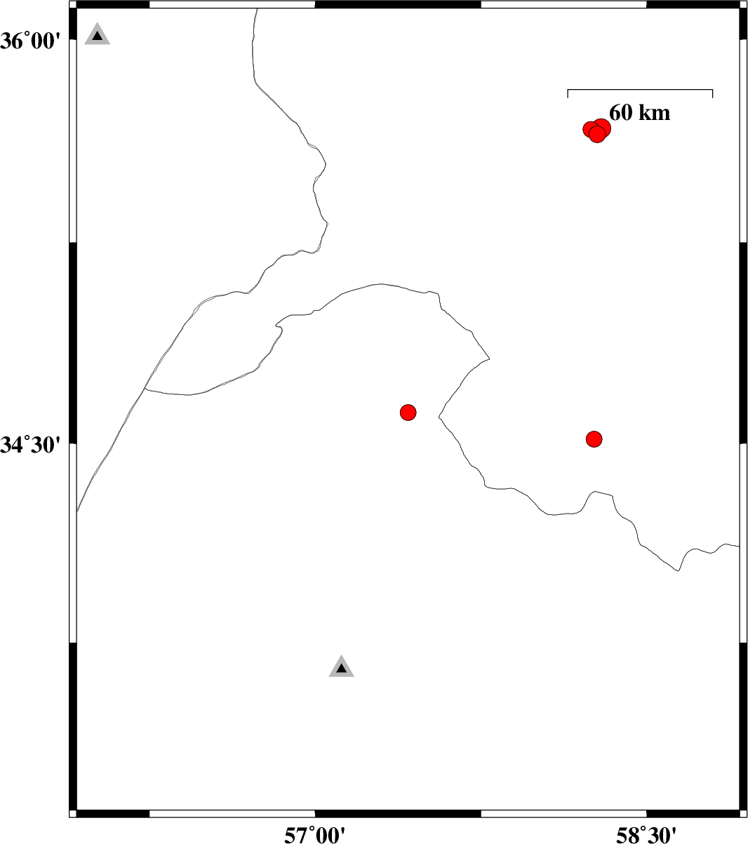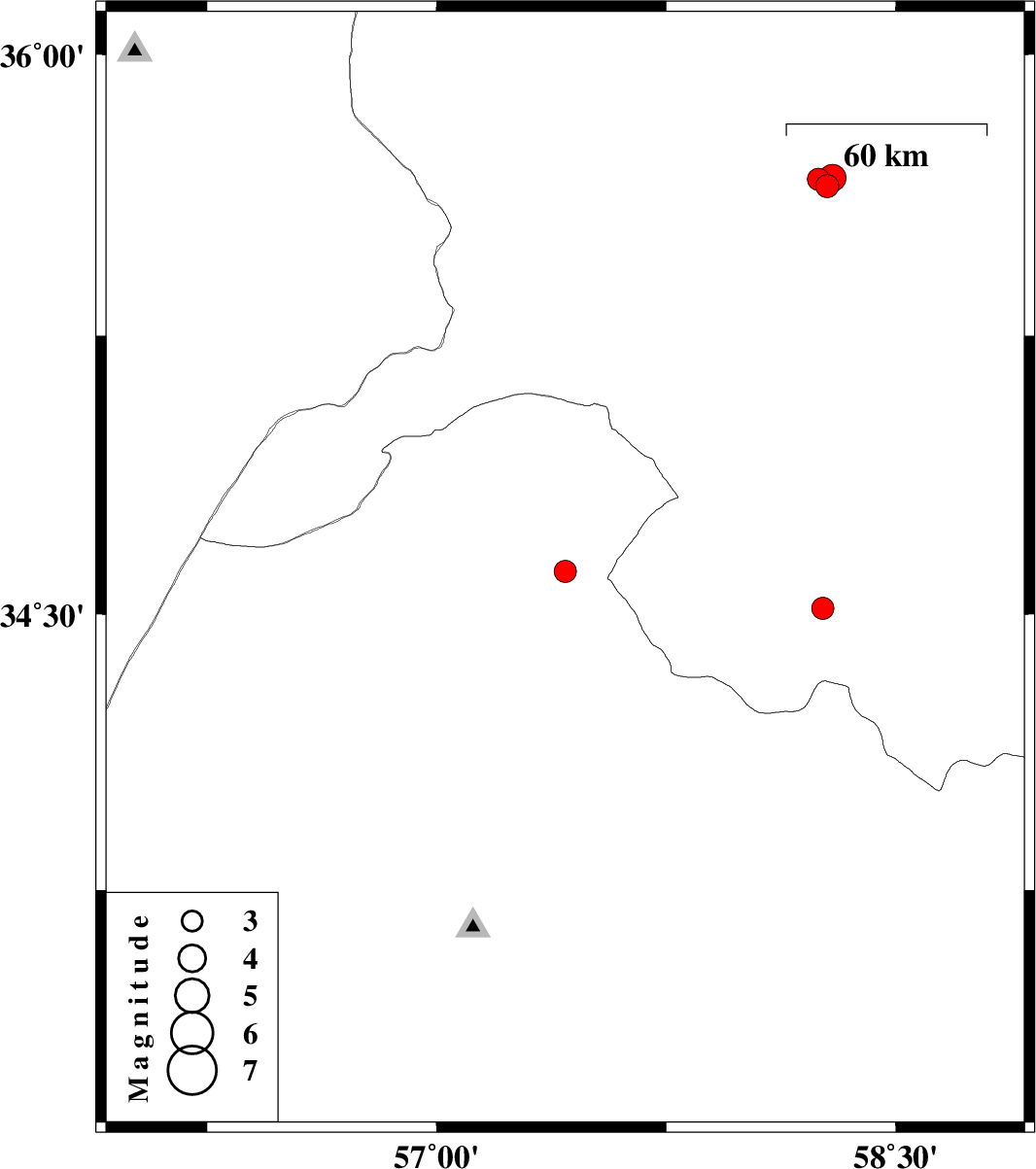 | 2022/01/21 | 18:07:33.9 | 21:37:33.9 | 34.615 | 57.42 | 18 | ML:3.3 | Yazd Province, 87 km South-West of Bardeskan | ||