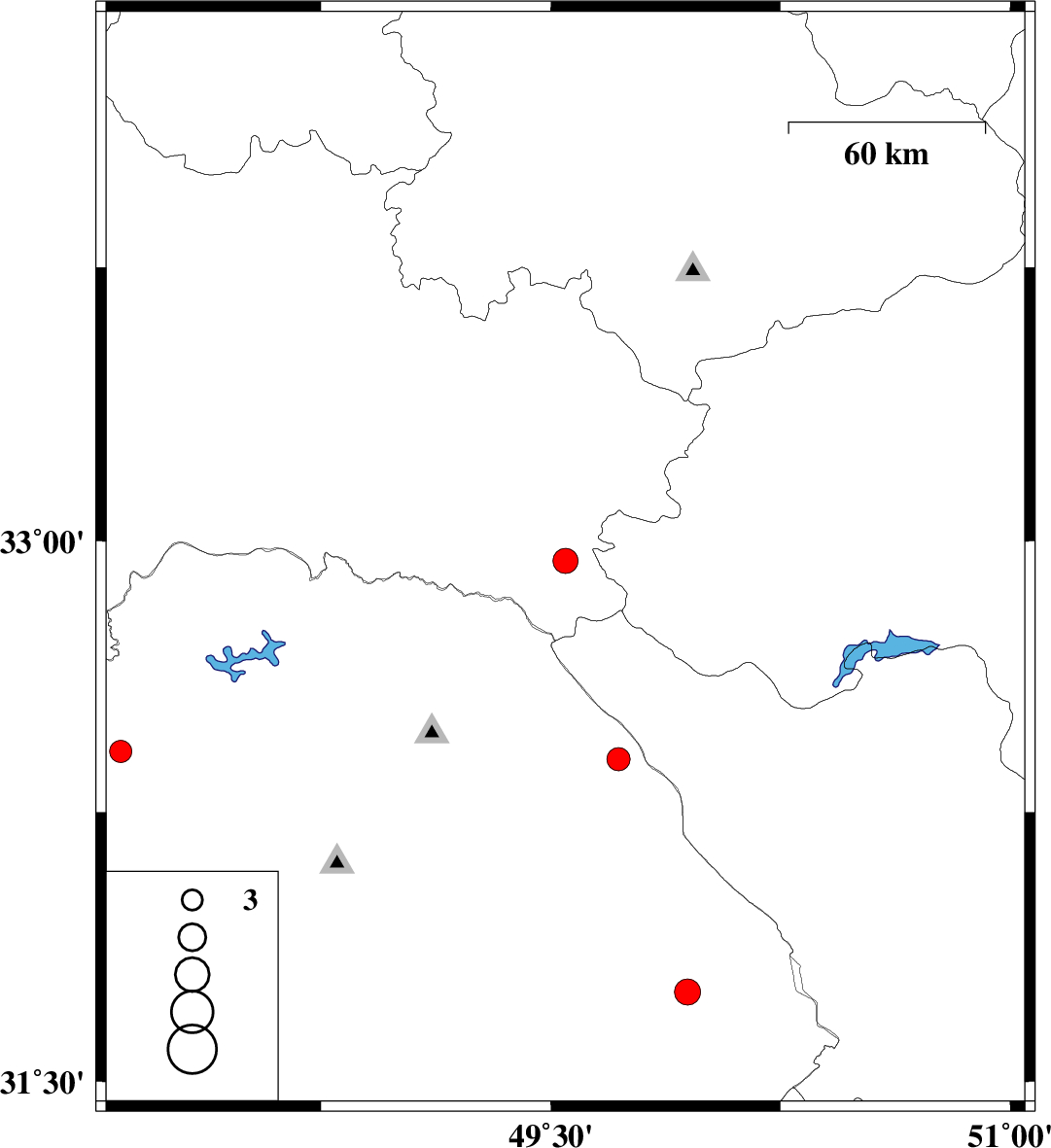 2022/01/30 | 14:12:21.2 | 17:42:21.2 | 32.945 | 49.548 | 9 | ML:3.6 | Lorestan Province, 53 km -West of Fereydunshahr | ||