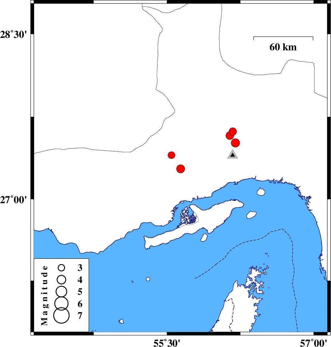 | 2022/02/09 | 23:07:28.1 | 02:37:28.1 | 27.579 | 56.143 | 12 | ML:3.6 | Hormozgan Province, 46 km North-West of Bandar-e abbas |