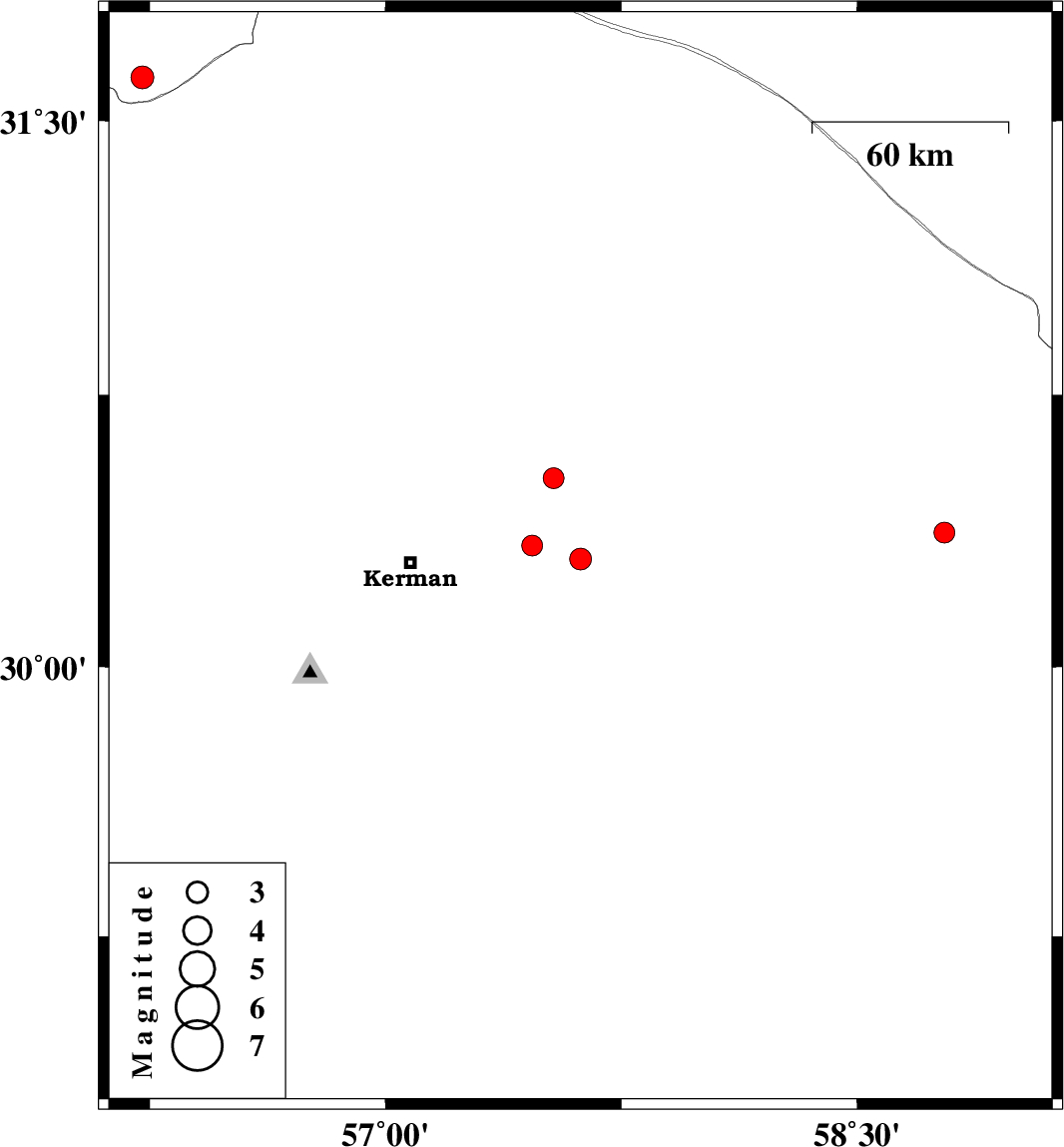 | 2022/01/27 | 22:20:30.9 | 01:50:30.9 | 30.335 | 57.466 | 12 | ML:3 | Kerman Province, 38 km -East of Kerman |