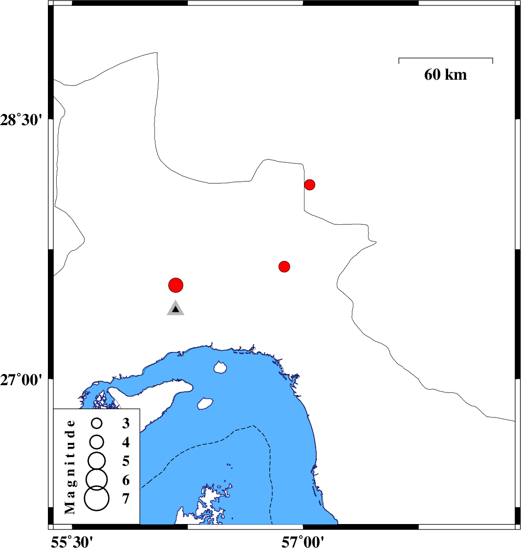 | 2022/03/15 | 15:43:21.3 | 19:13:21.3 | 27.65 | 56.877 | 12 | ML:3.3 | Hormozgan Province, 44 km North-West of Dehbarez | ||