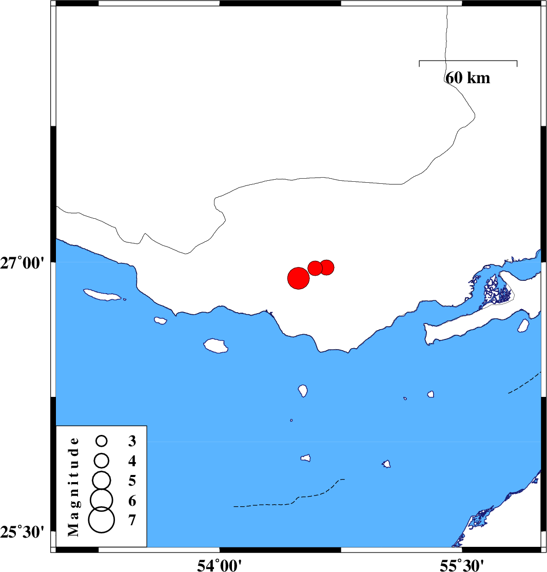 | 2022/03/16 | 23:15:44.0 | 02:45:44.0 | 26.91 | 54.487 | 15 | ML:6.1 | Hormozgan Province, 34 km South-East of Bastak |