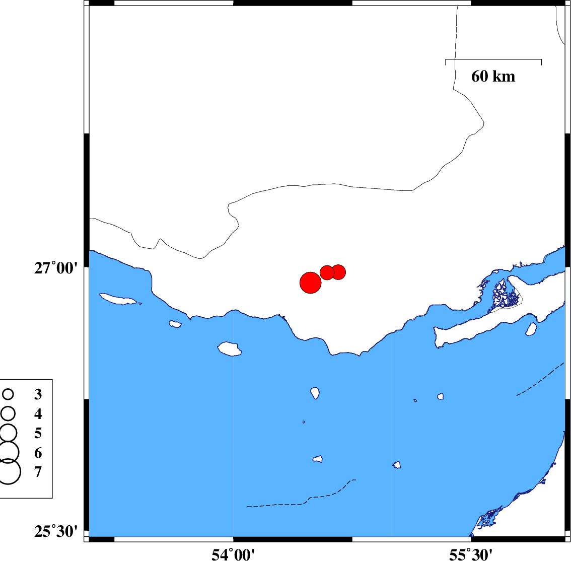 | 2022/03/16 | 23:34:41.4 | 03:04:41.4 | 26.966 | 54.591 | 12 | ML:4.1 | Hormozgan Province, 34 km South-East of Bastak | ||