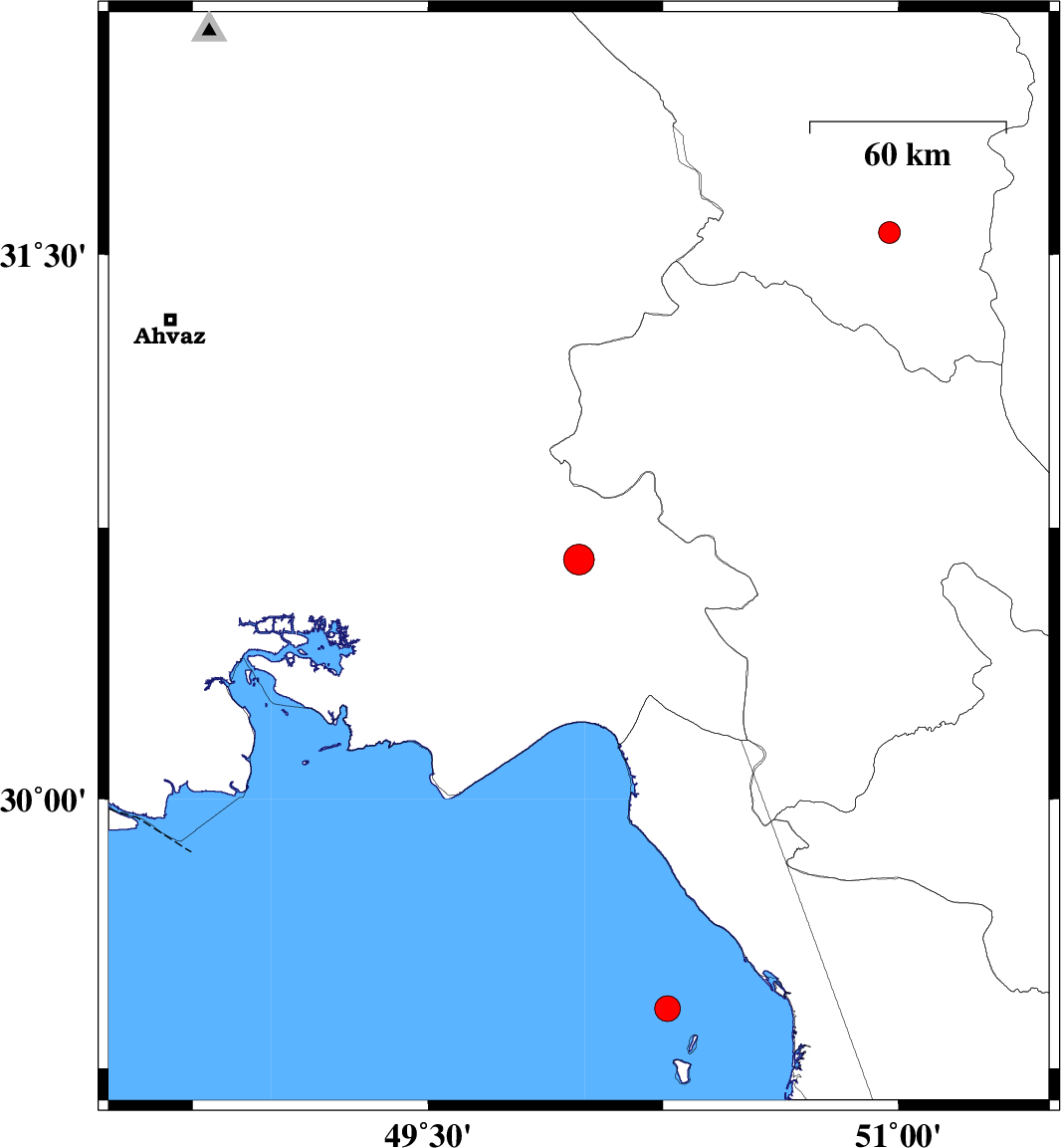 | 2022/03/31 | 04:09:44.6 | 08:39:44.6 | 30.662 | 49.981 | 8 | ML:4.4 | Khoozestan Province, 26 km -West of Behbahan | ||