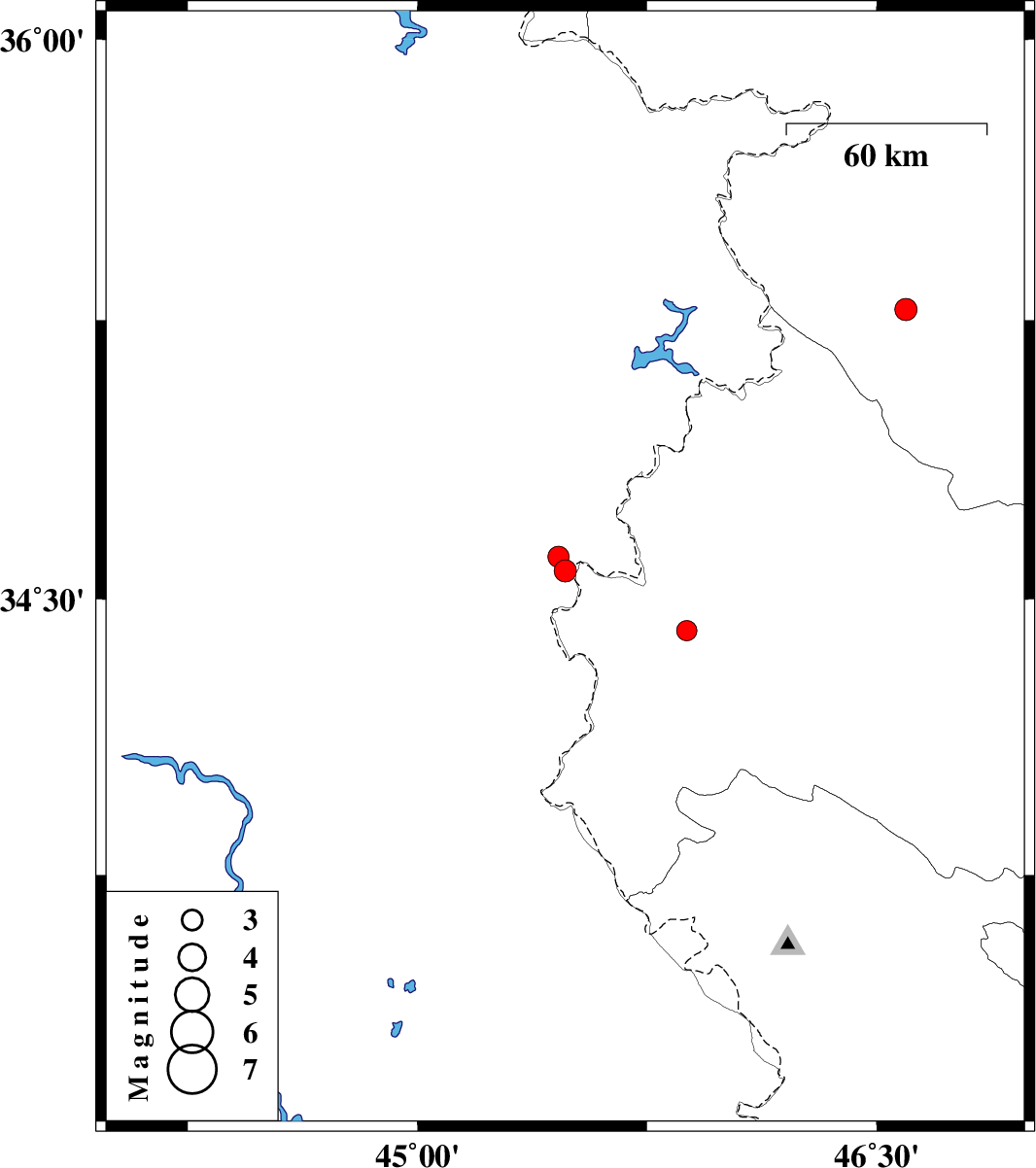 | 2022/04/02 | 12:05:45.0 | 16:35:45.0 | 34.576 | 45.483 | 12 | ML:3.2 | Iraq, 11 km -West of Qasr-E-Shirin | ||