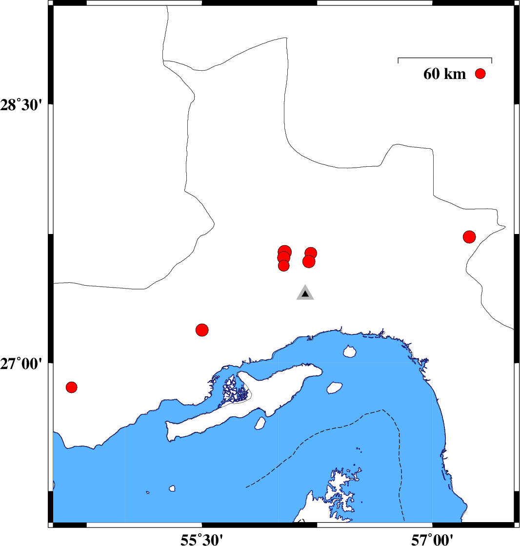 | 2022/04/27 | 19:30:12.2 | 00:00:12.2 | 27.732 | 57.24 | 14 | ML:3.7 | Hormozgan Province, 34 km North of Dehbarez | ||