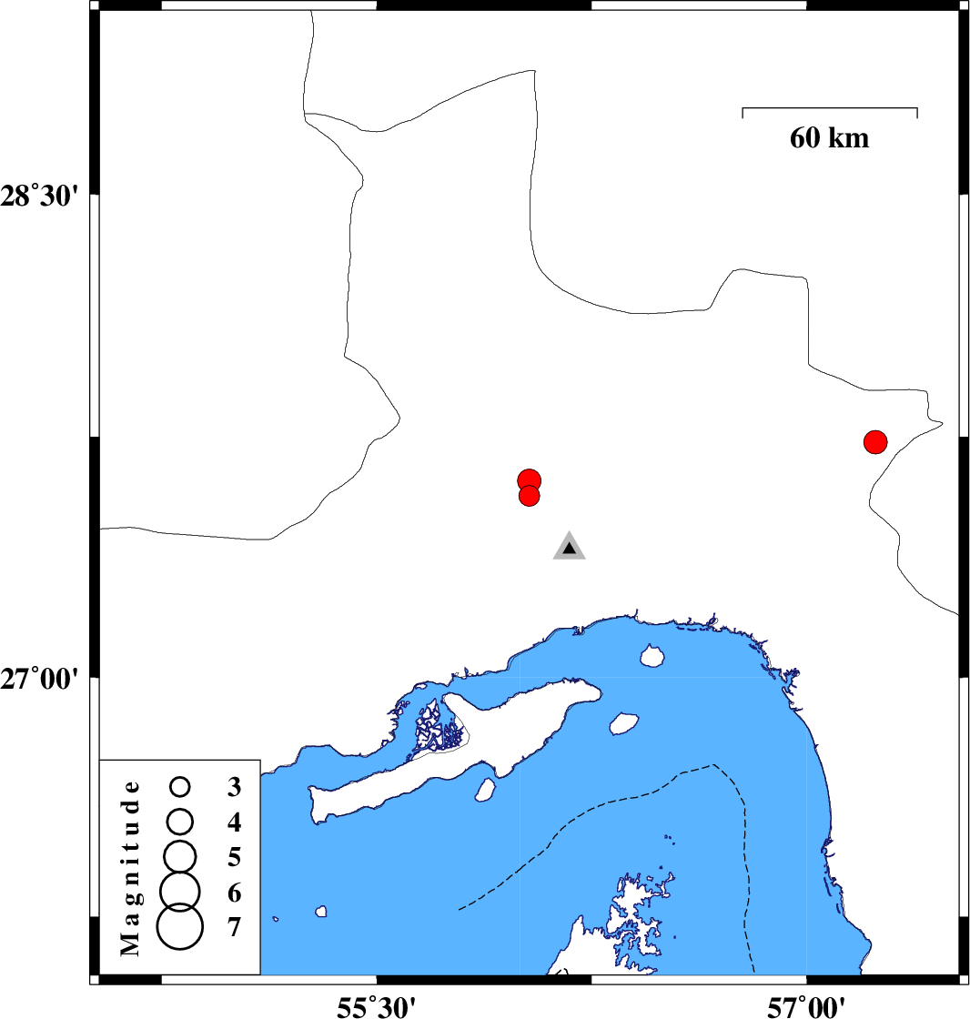 | 2022/04/27 | 19:30:12.2 | 00:00:12.2 | 27.732 | 57.24 | 14 | ML:3.7 | Hormozgan Province, 34 km North of Dehbarez | ||