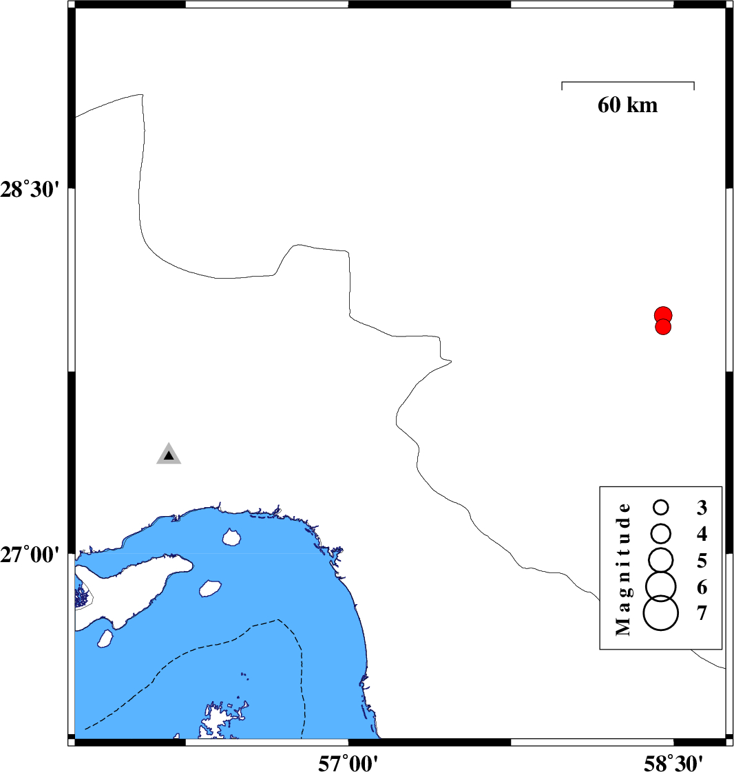 | 2022/04/27 | 19:30:12.2 | 00:00:12.2 | 27.732 | 57.24 | 14 | ML:3.7 | Hormozgan Province, 34 km North of Dehbarez | ||