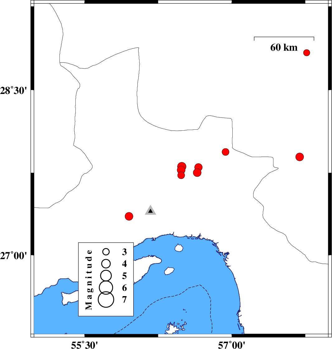 | 2022/04/27 | 03:03:09.6 | 07:33:09.6 | 27.566 | 56.032 | 12 | ML:3.3 | Hormozgan Province, 49 km North-West of Bandar-e abbas | ||