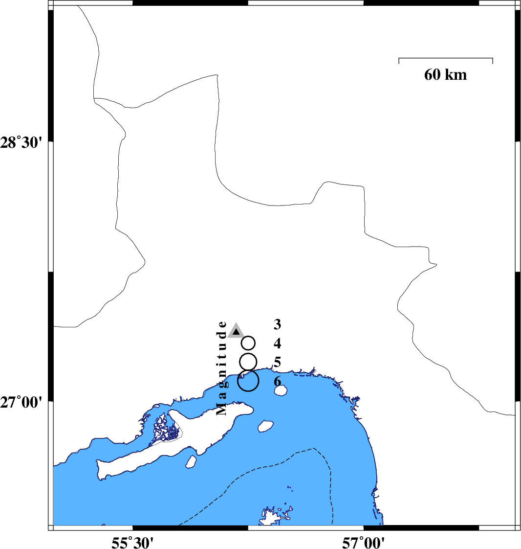 | 2022/04/27 | 19:30:12.2 | 00:00:12.2 | 27.732 | 57.24 | 14 | ML:3.7 | Hormozgan Province, 34 km North of Dehbarez | ||