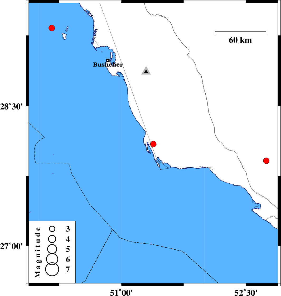 | 2022/05/05 | 20:50:27.0 | 01:20:27.0 | 28.094 | 51.384 | 12 | ML:3.2 | Bushehr Province, 62 km South of Khormog | ||