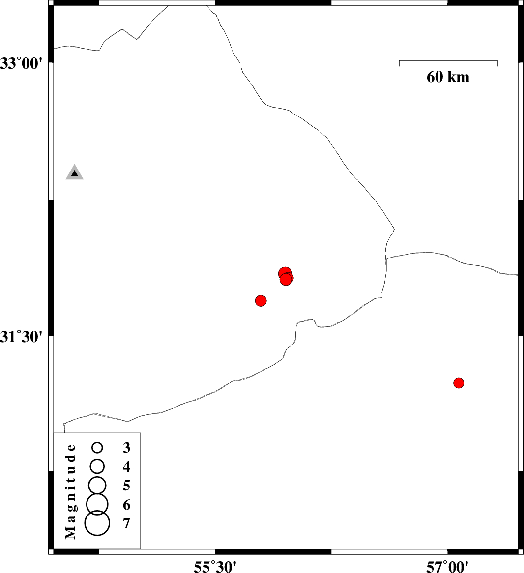 | 2022/05/12 | 06:16:41.4 | 10:46:41.4 | 31.82 | 55.969 | 10 | ML:3.2 | Yazd Province, 59 km North-East of Bafq | ||
