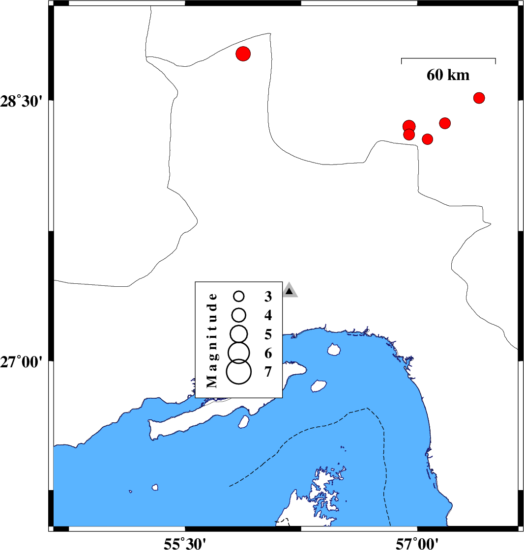 | 2022/04/27 | 19:30:12.2 | 00:00:12.2 | 27.732 | 57.24 | 14 | ML:3.7 | Hormozgan Province, 34 km North of Dehbarez | ||