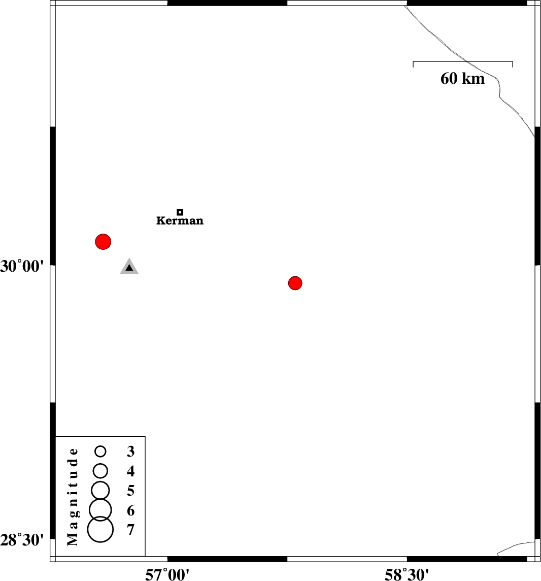 | 2022/05/17 | 21:35:11.8 | 02:05:11.8 | 30.128 | 56.598 | 12 | ML:4.4 | Kerman Province, 23 km North of Bardsir |